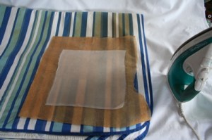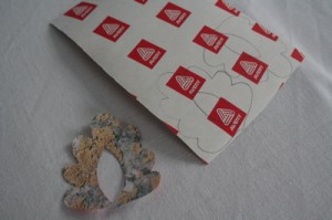 8. At this point you can have a look at the transfer and see if it’s working out. Mind your fingers as the paper will be hot. You should be able to lift off the paper design backing and leave your transfers stuck to the fabric. Remove the design now, it’s done it’s job. Check the transfer shapes are all firmly stuck to the fabric. If there are some areas not quite stuck, then cover the whole design with greaseproof again and PRESS a few more seconds.