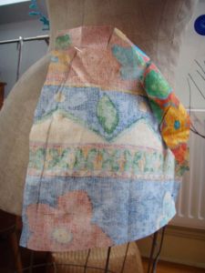 Very simply, I followed the original seams which resulted in a jacket-like bodice which was open at the front. I machine-sewed all the bodice pieces, leaving the centre front open and sewed this up by hand once I had carefully positioned the bodice on Maud, matching up the seams where I could. I then added the hip-part which was sewn up along the back seam. I hand sewed the front seam and the hip to bodice join. I simply gathered the bottom hem underneath to bring the fabric to a smooth finish without having to nail it on to the wooden based. The last stage was the shoulders – I left lots of fabric here so I could gather the loose fabric into a tight circle. I then cut out large circles of fabric and gathered the edges (like a suffolk puff / yo yo) and hand stitched them down to cover the shoulder gathers.