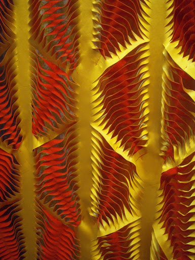 Manipulated fabric pieces by Helen Reeve who was last year’s placement student with me. Love her use of colour in these double-sided slashed fabrics.