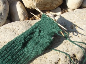 Alas the on-beach knitting was done a few weeks ago and today’s knitting has been pretty sea-free on the sofa, but I have completed a very-delayed birthday present of these fingerless mittens. Now I’ve just got one last-year Christmas present to complete and things will be looking good!