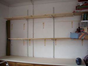 So anyway, much drilling and swearing later I got the shelves up on the right hand side of that wall and with much less swearing I got the left hand side up. I’ve no idea why the second lot was easier, but it was. Phew.