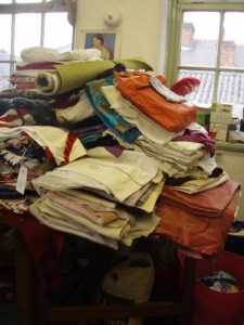 I dread to think of the weight of fabric I have. The two guys who loaded the van when i moved might hazard a guess at about 15 gazillion tonnes. This is only the stuff on the inherited shelves – the newer shelves I put up a couple of years ago are still fully dressed in their array of textiley goodness.