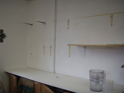 In contrast the studio has incredibly solid walls that are sooooooo hard that even my entire weight behind the hammer drill is not always quite enough to get the screw holes deep enough. Which is presumably why the previous tenant left shelves that were kind of stuck on the wall with paint and willpower.