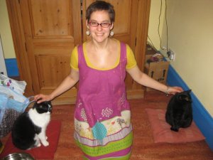 Although admittedly, these here happened before Christmas. Neither photo was taken with the aim of showing off the dresses at their best advantage, and indeed in both I may have partaken a little wine. But to prove that I do still sew now and again, I give you two dresses (well actually I give you the photos, I’m not giving away either of them, no no no). You also get to see glamorous corners of the kitchen and my two very lovely cats.