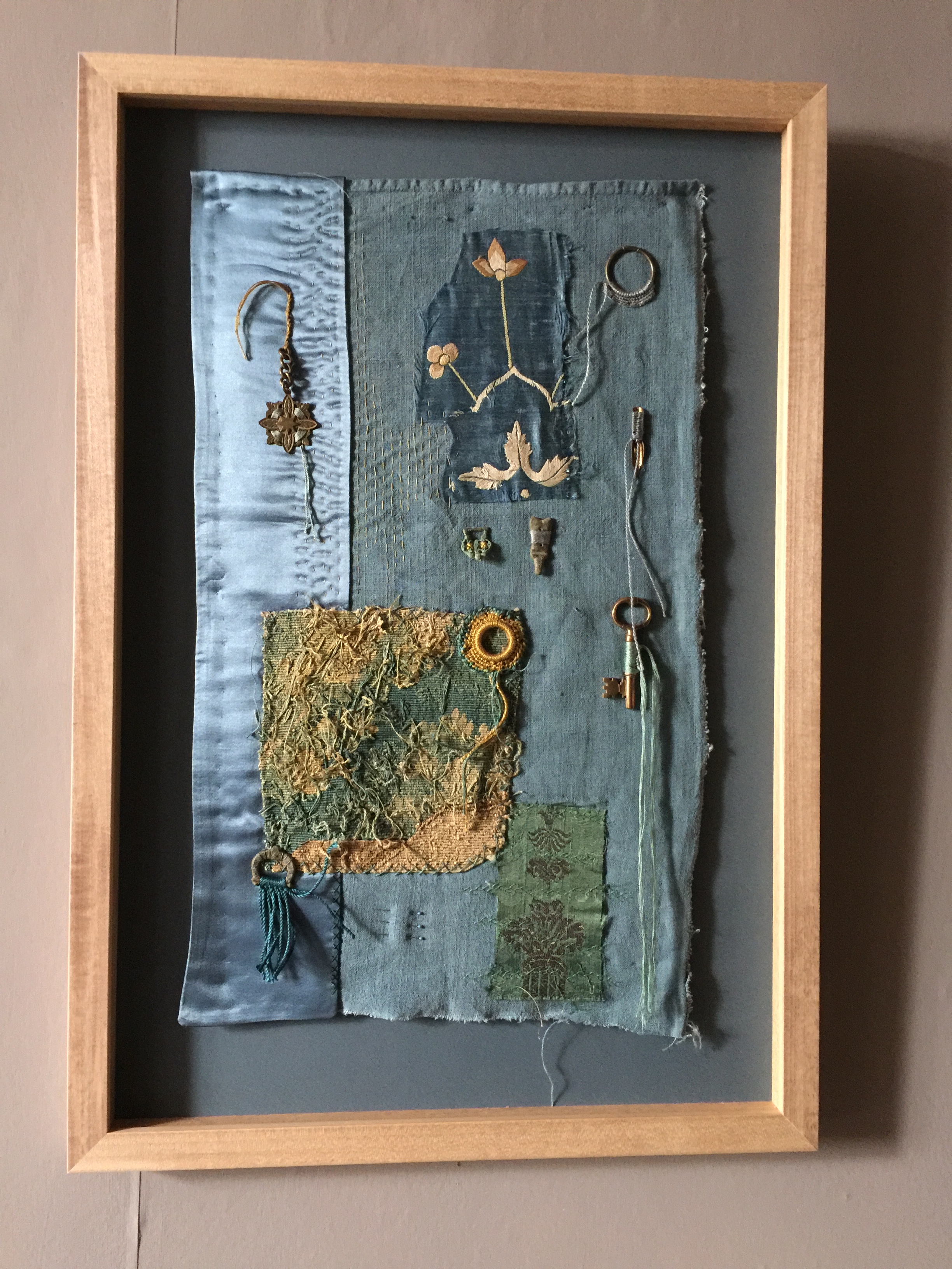 The large panel is worked onto blue linen with scraps of antique fabrics including 18th century tapestry, 19th century embroidery and 17th century brocade. I’ve added lots of hand embroidery details and several found objects embellished with hand stitch and silk threads. The objects include medieval metal detector finds including belt ends and buckles. I love these little details and the historical stories in the textiles, all of which are meaningful to the customers.