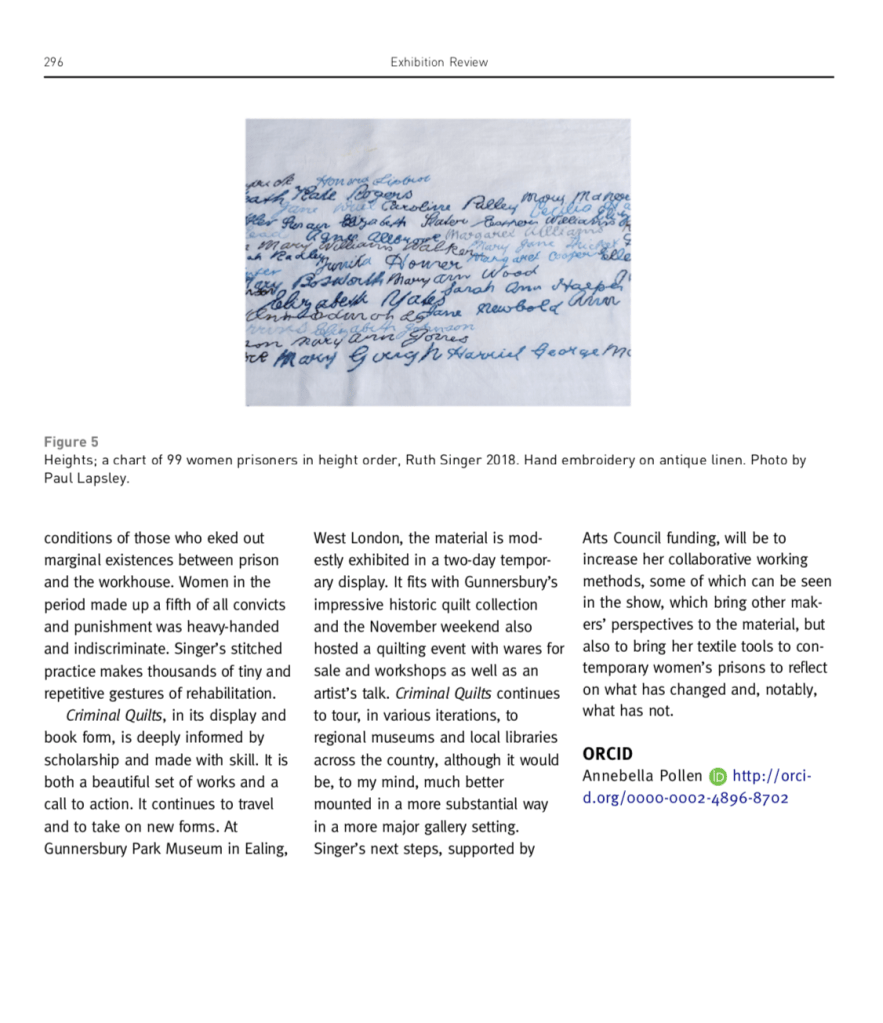 My Criminal Quilts exhibition has been reviewed in the academic journal Textile: Cloth and Culture, by Dr Annebella Pollen, Principal Lecturer in the History of Art and Design at the University of Brighton.