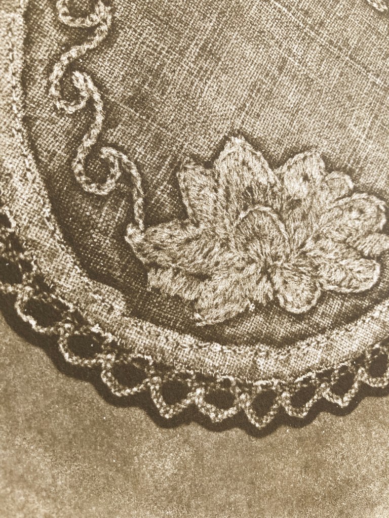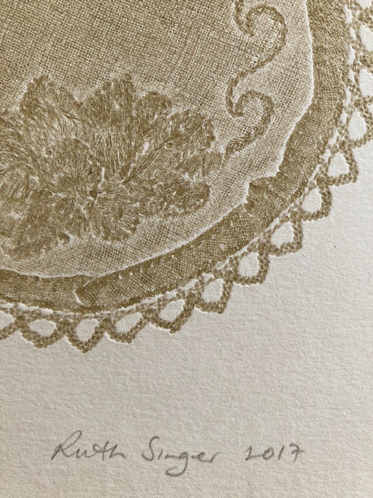 The prints are part of a continuing research project to find ways to preserve and record textile processes. I use print as a way of taking a record of the patchwork with the tacking and papers still in place. The sepia ink gives the print a feeling of an x-ray and the details of loose threads, weave and paper texture invite you to look closely and see patchwork in a different way. I’ve also created a series using embroidered textiles, some of which also have am altered textile piece alongside the print. You can see more of my print work here. If anything that’s not in the shop catches your eye please get in touch and I can let you know what is available.