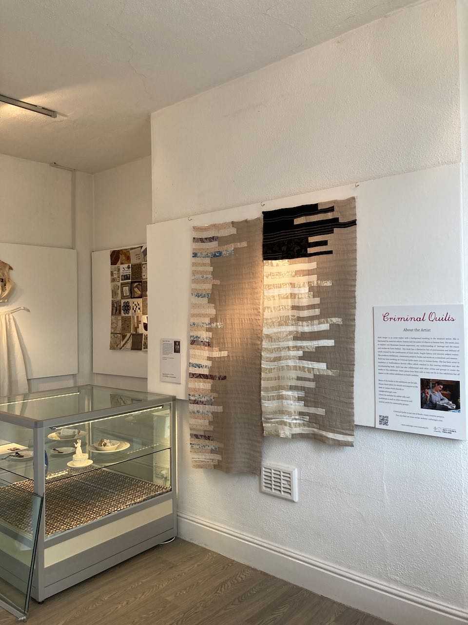 Museums are open again! I’m so pleased to have got this version of the exhibition open just a couple of week’s later than it should have been. Erewash Museum is a lovely old building, just perfect for showing a smaller version of Criminal Quilts in an intimate domestic scale space. With social distancing in place, I installed this entirely by myself so the small gallery space was welcome! I have added a time-lapse of putting up one of the piece at the end of this post for your entertainment. The exhibition is free and the museum is open Tuesday, Thursday and Saturdays 10.30am-3pm. You will need to book in advance with the museum.