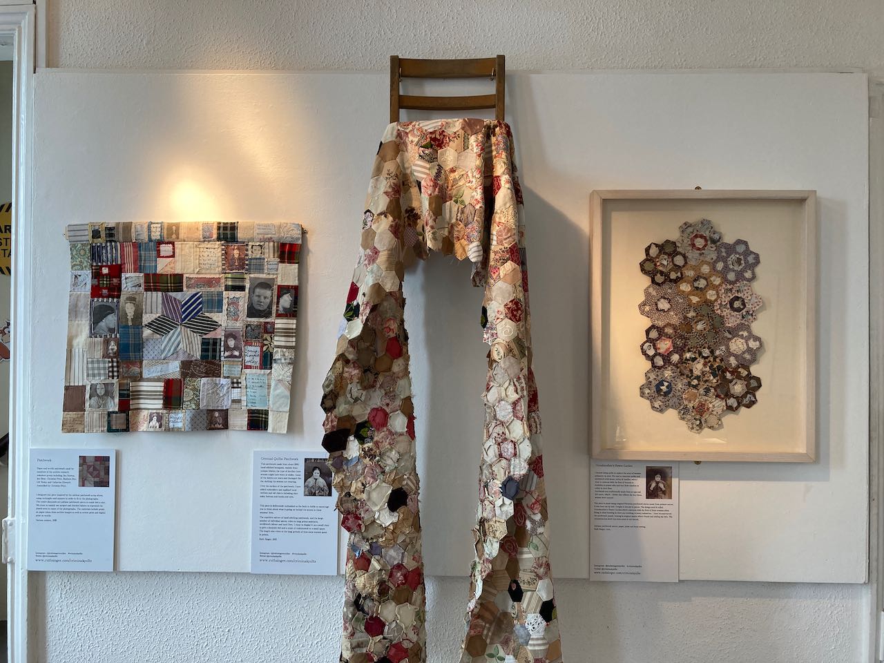 A new version of Ruth Singer’s Criminal Quilts exhibition is now open at Erewash Museum, Ilkeston, Derbyshire until 15th June 2021.