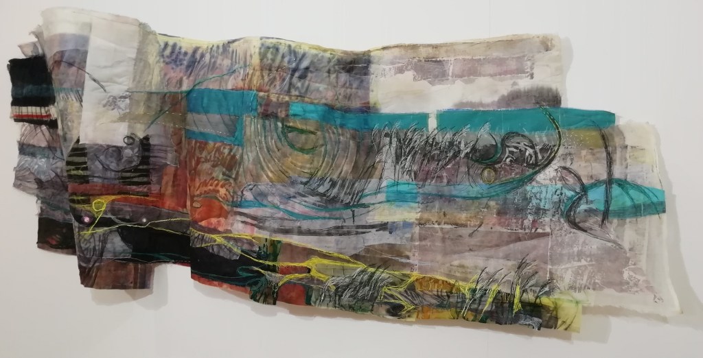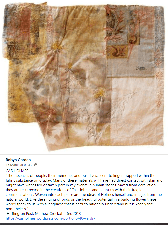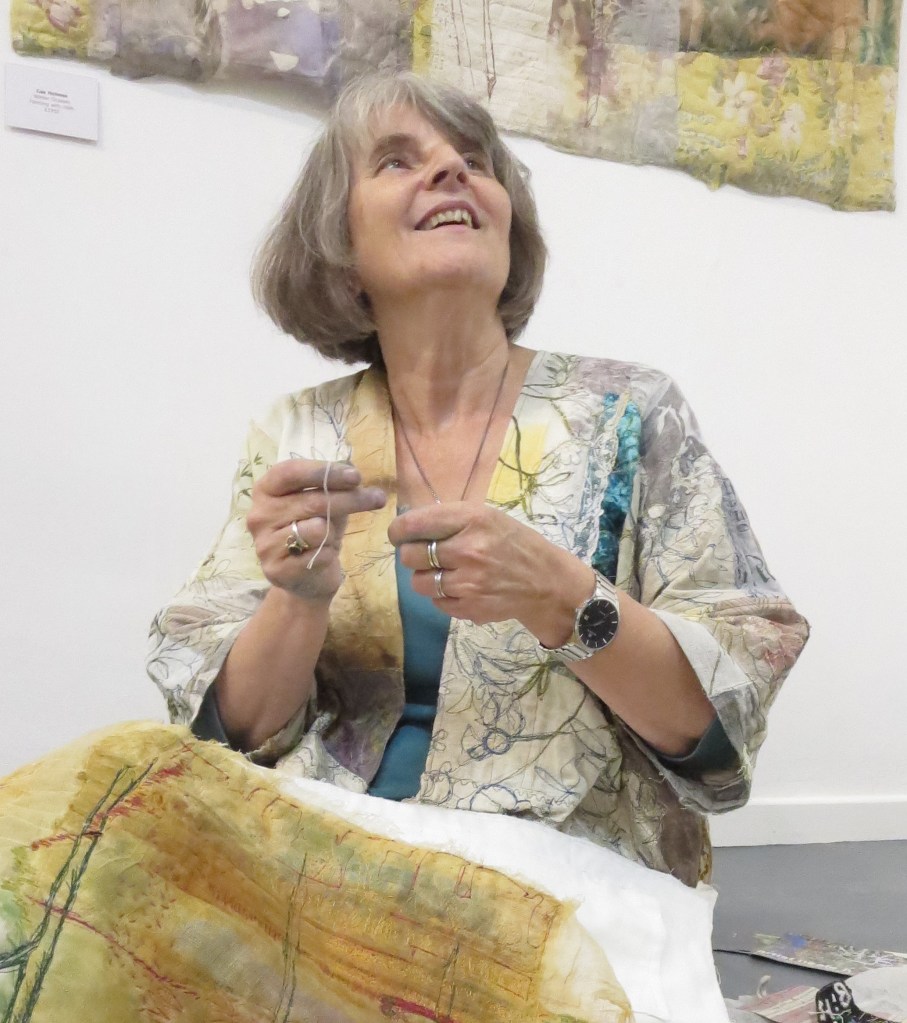 Cas Holmes is interested in the liminal, ‘in between’ spaces connecting land, place and environment. Trained in fine art, her work combines mixed media with found materials and stitch and is best described as ‘painting with cloth’. She is a tutor at the prestigious West Dean College and trained in community arts working in areas of health, education and environmental arts practice. The challenge of working on site-specific and commissions continues to inform her practice