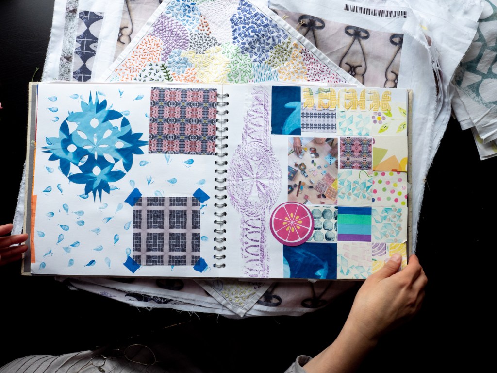 I don’t like the term sketchbooks as it implies drawing and like many textile makers, drawing is not part of my process. I sometimes do annotated simple drawings but I don’t sketch. I struggled through my A-Level art aged 18 with some additional drawing tuition and have done very little representational drawing since. It’s just not a process I enjoy. I love mark making and creating patterns with pens, pencils and crayons and created a book of patchwork-inspired designs for colouring a few years back.