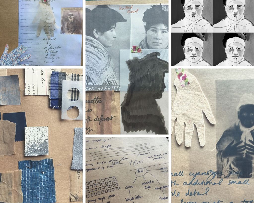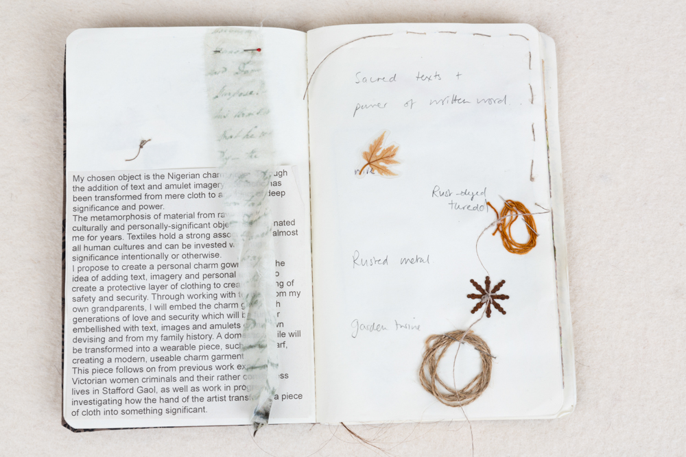 For the first part of Criminal Quilts, I had notes and sketches and ideas in a lot of different notebooks and studio books and really regretting not keeping it all in one place. When I started the 2017-18 Criminal Quilts residency, I knew I needed to keep a project book which I would share as part of the project. It has been to many workshops, talks, events and open days. Although I started making it as a public resource, it is also my working sketchbook or planning book. I have notes of pieces that I have since made or since abandoned, and things that are parked for the future. It has a lot of notes, lists, scribbles, mind-maps and drawings as well as the collected materials of inspiration. It helped me to have all this in one place while I was doing the residency as so little of the project happened in my studio. I was able to carry it all around with me. Having said that, the huge heavy hardback book I chose, whilst being perfect for display, was a pain to carry around on the train / on foot! I used a wheelie suitcase a lot for that project as my sketchbook was too big for a rucksack.