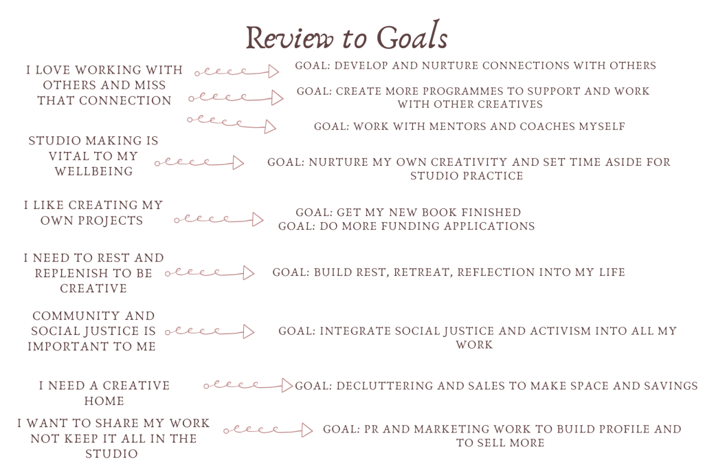 The pandemic changed my priorities in work and life and continues to change how I want to work and live in the near and distant future. My goals haven’t been a stick to beat myself into working harder, they have been a guiding light for how I want to live my life and run my business. By reviewing my goals I can see how much my thinking has moved on in the last year and how I can be more gentle with my goals this time around and adapt to the changes life keeps throwing at us.