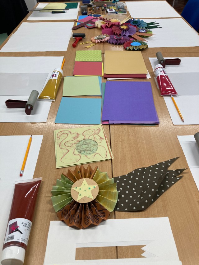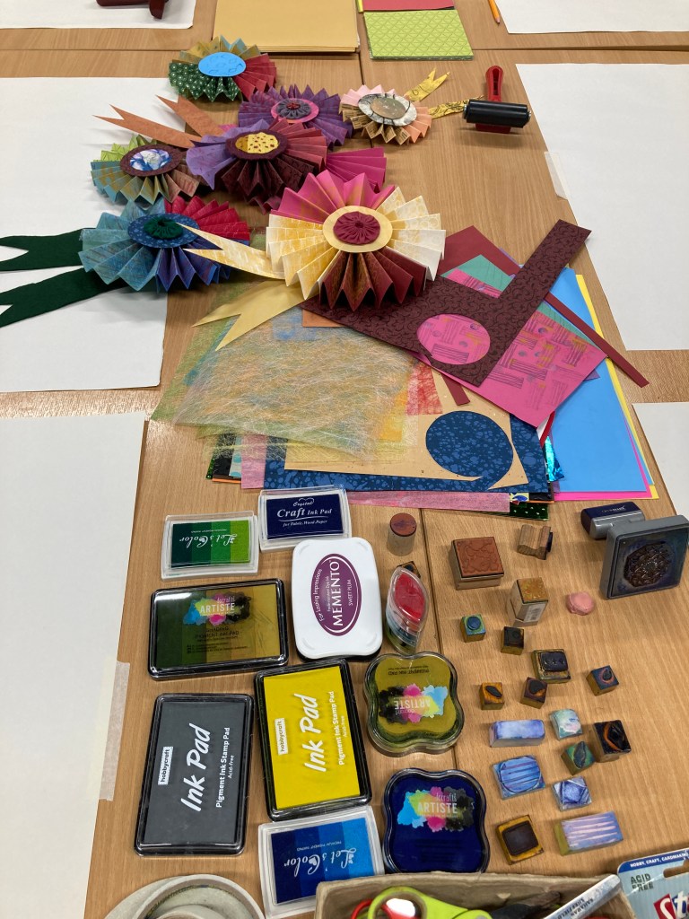 I wrote instructions and printed booklets with photos to go with make-at-home kits while Mandeep prepared printed and hand drawn papers for the kits and workshops. And then we got started. Over 50 rosettes were made and contributed to the project over the summer and we then had to work out how to bring them together and display them in a way which allowed us to move it around easily and return the rosettes to their makers after the tour ended.