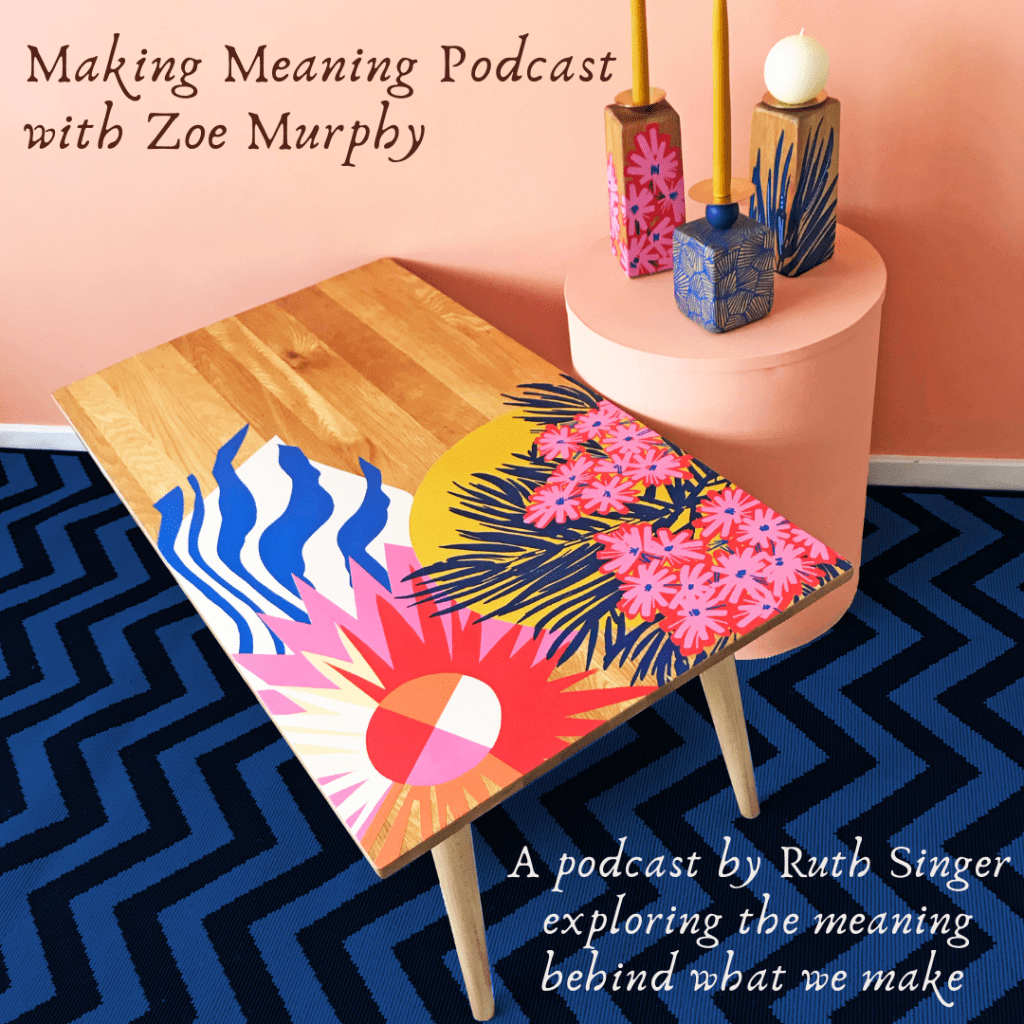 Episode 32 of Making Meaning is with designer and all-round creative powerhouse Zoe Murphy. Zoe works with colourful screen prints to transform old furniture into amazing, meaningful pieces. We talk about her multi-faceted creative life, about connecting and sharing creative joy and about how storytelling and research are fundamental to how she works.