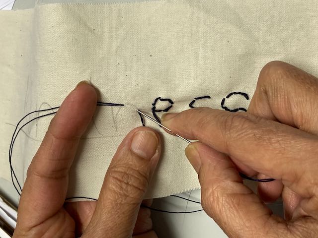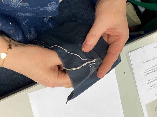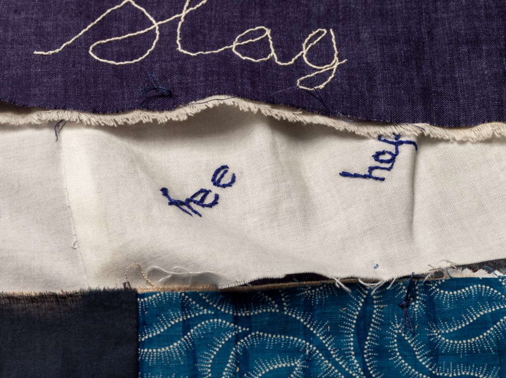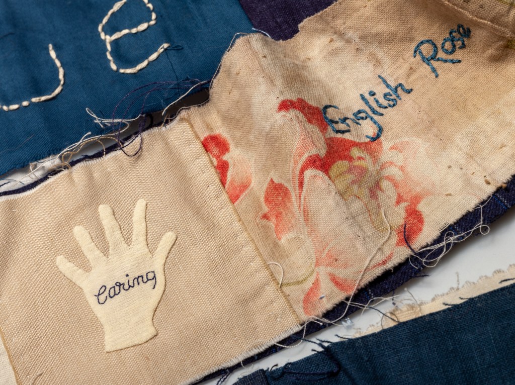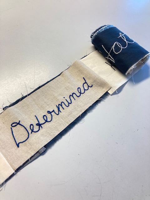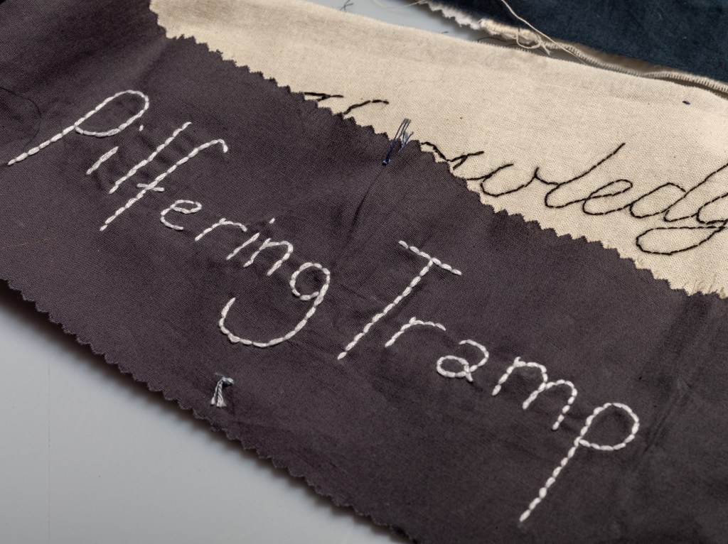 The words on dark cloth are the negative labels or words used in Victorian documents, or words chosen by contributors. Contributors chose words which had been used about themselves at some point or they had heard used negatively about women. The words on light backgrounds were intended to be a contrast, a challenge to the negative stereotypical words written on the dark backgrounds. The words are not all ones I would choose, and not all really fit the brief as I intended, but in the spirit of enabling women’s voices to be heard, I have not I have not directed, curated or selected the choice of words to include, except by giving a list of the words used in Victorian documents, such as Pilfering Tramp. I love the wide variety of different interpretations that the stitchers have made, particularly in the interpretation of the positive language – rather than descriptions, some have stitched affirmations and hopes.