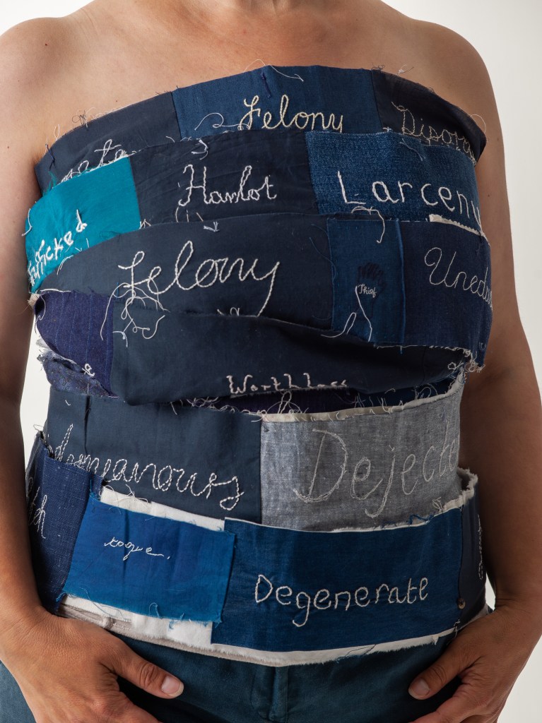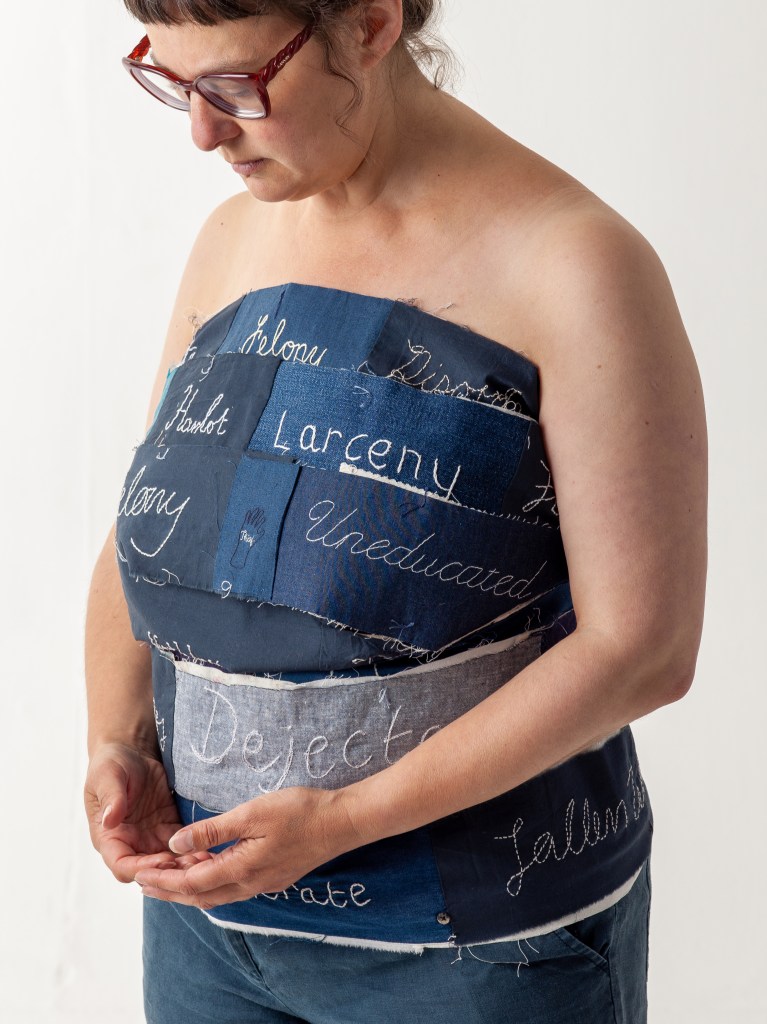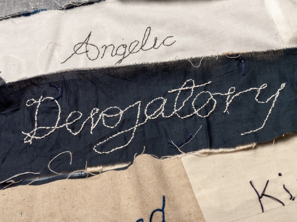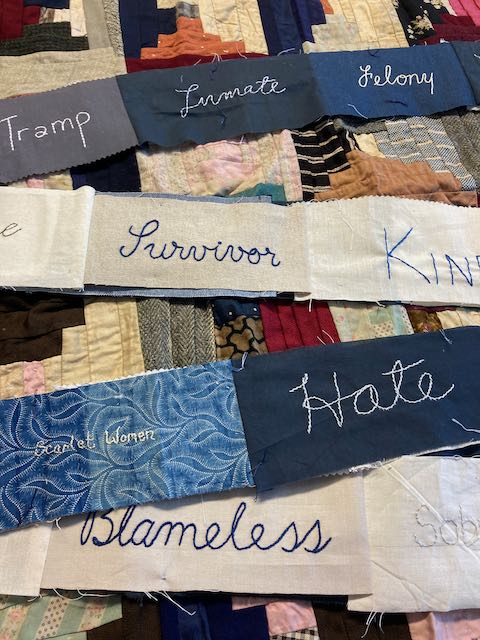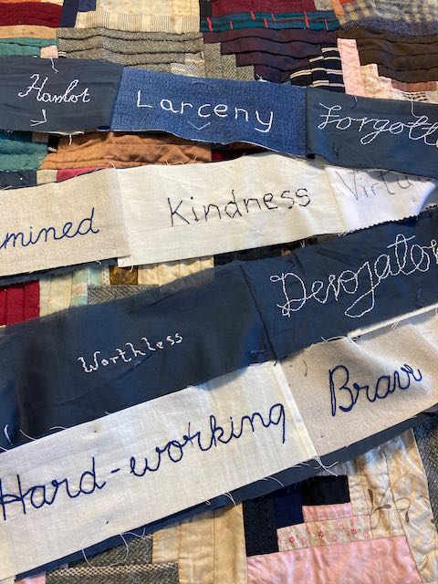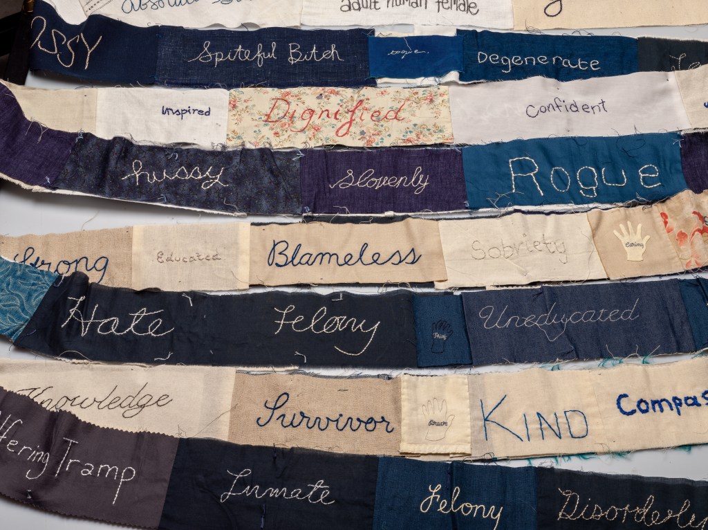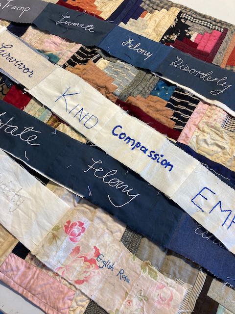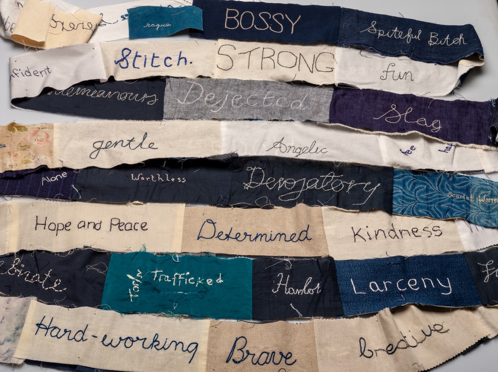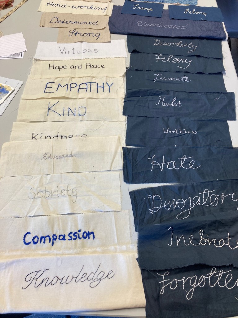 Way back in 2022, as I was preparing the final version of Criminal Quilts exhibition for Llantarnam Grange, I devised a collaborative project to mark the end of over 10 years working with the stories of women in the criminal justice system in the 19th century. The idea was to create a collaborative artwork with stitched words reflecting on the negative or judgemental words used to describe women in the Victorian documents and some contrasting or positive words.