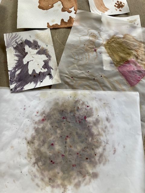 We collected berries, moss and mud to use to create marks on paper. The idea was to look at the abundance of colour and texture in this landscape that we know and love. We talked about deep connection with the soil and the plants that grow here. We used hawthorn and blackberries to splat into paper and to paint with. We collected the local clay-rich red soil and tried drawing with the dry lumps and painting with water added. We used fresh walnuts to make marks from the blackening skins and tried out inks made from other berries. We used twigs to draw with and squashed flowers like fuchsia for their bright colours.