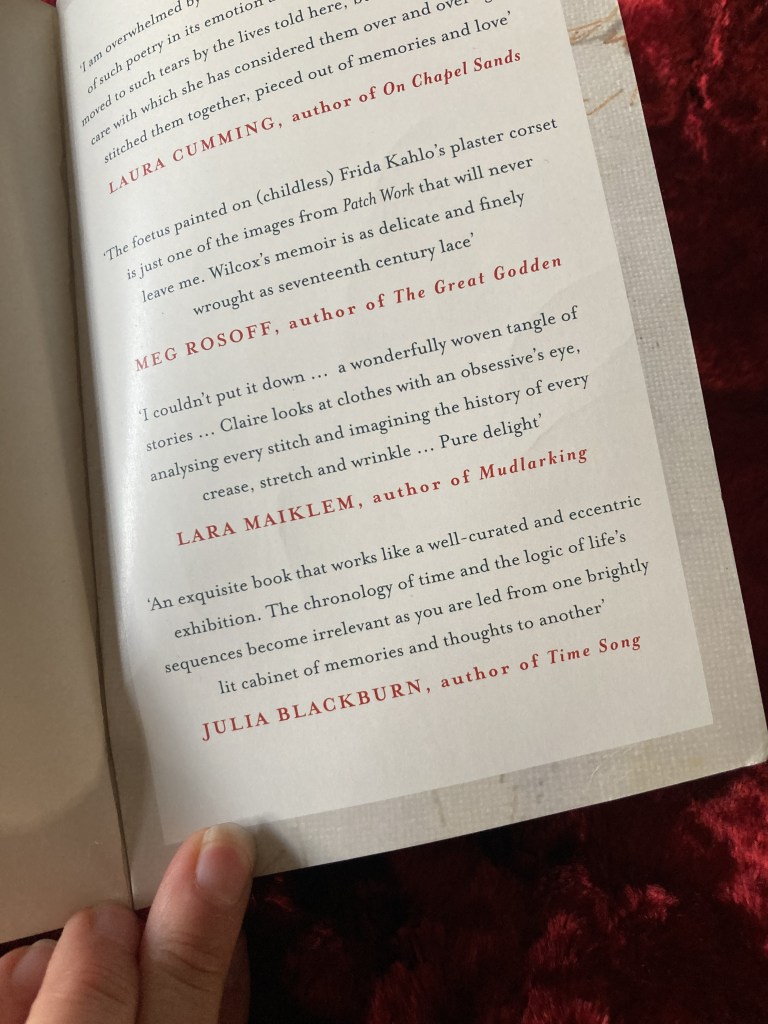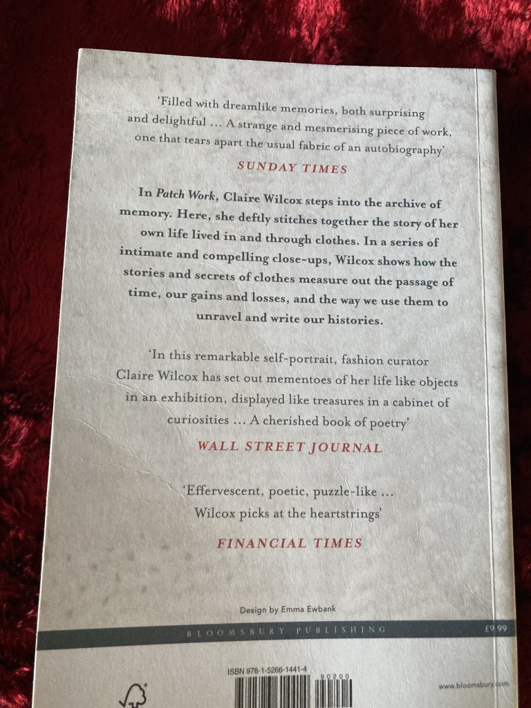 She’s right, it’s like an exhibition. This book doesn’t, can’t, tell the full story with all the facts in order, but it creates an impression, it solidifies memories and experiences and emotions into words, not using clothes or cloth as a narrative device, as I’m doing in this review, but as just there, part of life, part of her life. Other reviews describe it as poetry and biography. To me, it’s more like an artwork, a series of artworks, pieces, like I try to make, that tell stories, share memories and personal narratives without give you every detail or all the background. Each tiny chapter is an exquisite artwork, threads coming together and combine in detail and leaving some ends loose, some cloth unstitched, knowing that this does have to be a full picture or be emotive and absorbing. It is a confusing book to explain, to categorise and because of this, it feels so familiar, because my work, my way of storytelling, is hard to categorise too. I don’t know what genre this book falls into and I love it all the more for that. I want to read books about textiles but not descriptive and factual, I want to read about personal connections with cloth and memory and connections. This book feels so comfortable and pleasing to me, now I have recognised it’s similar to how I work with cloth. It’s made me realise that I don’t work with words in the same way I do with cloth. My writing tends to be descriptive and trying to get a message across. I have always thought that my straightforward way of writing stems from my museum training, from having to describe an object and it’s cultural context in 50 words, for a reading age of 12. I know I am not doing that any more, and it’s a relief, but that discipline is still part of how I present words on a page. Yet this book, Claire’s book, is also written by someone who has written museum labels and has spent many more years than me doing it. Perhaps the brevity of each chapter is influenced by the writing of short gallery texts, without rambling or using more words than is necessary, maybe that’s the poetry form other readers have recognised.