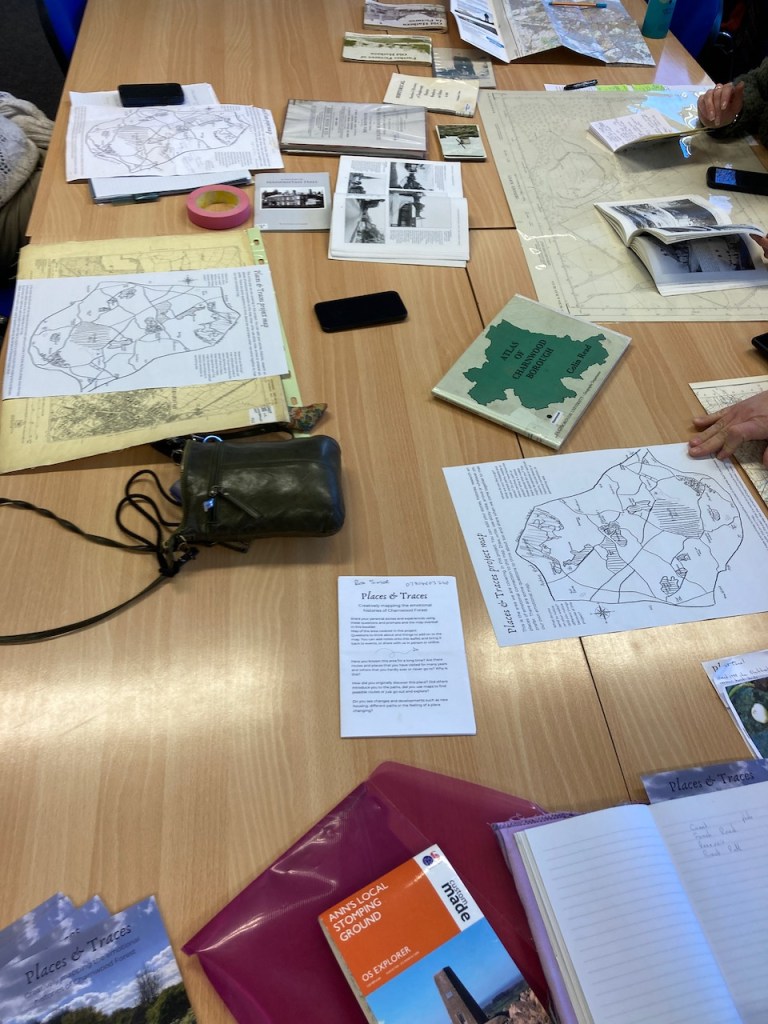 Places and Traces project is developing quickly now. Last summer we went on walks and did wild workshops in the woods and orchards, and spent the winter meetings in the local studies library exploring maps and documents.