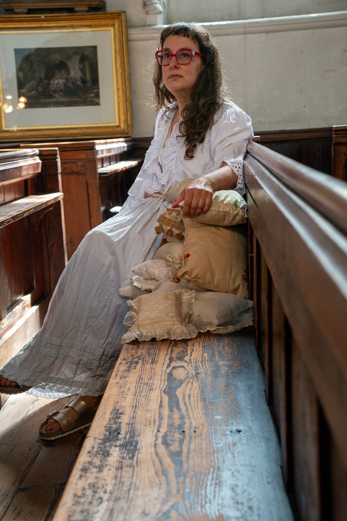 Alongside the museum collections, there are seven new pieces of work by me, reflecting on Mary Linwood’s life, story and legacy. I had some of these works photographed in the atmospheric church in Leicester where Mary attended and is buried.