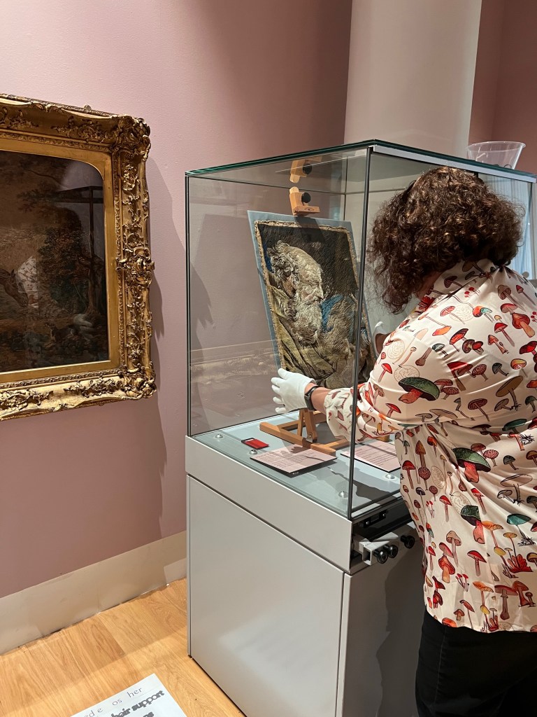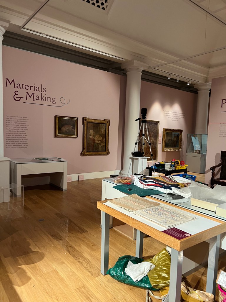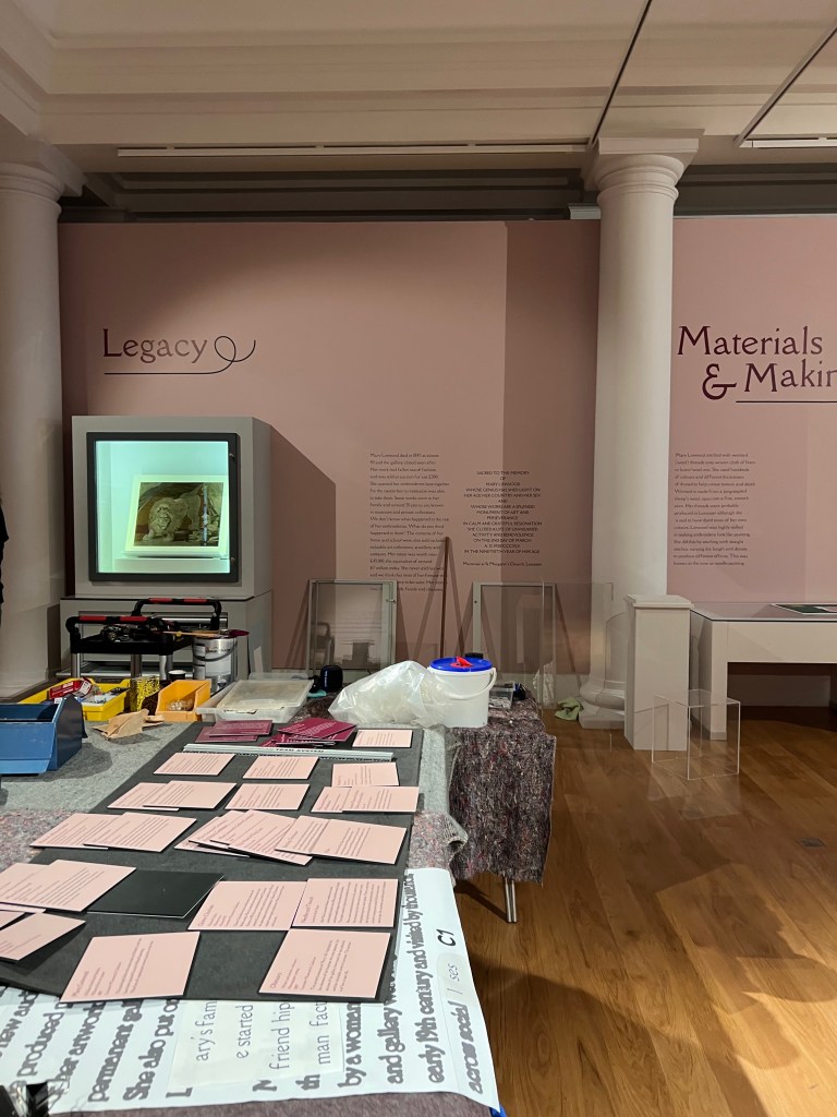 I spent a lot of time matching labels to objects and checking everything was in the right place. We also installed my work, putting my pieces into cases and adding perspex covers – then taking them off again so I could tweak and fuss! I also put together the folders of additional information which are small but important aspects of the gallery. They contain images and transcripts of Mary Linwood’s letters (having done the transcripts the week before with help from my dad), large-print transcripts of documents in cases that are too small to read, images of the backs of three Mary Linwood embroideries and the insides of two exhibition catalogues that are in a case.