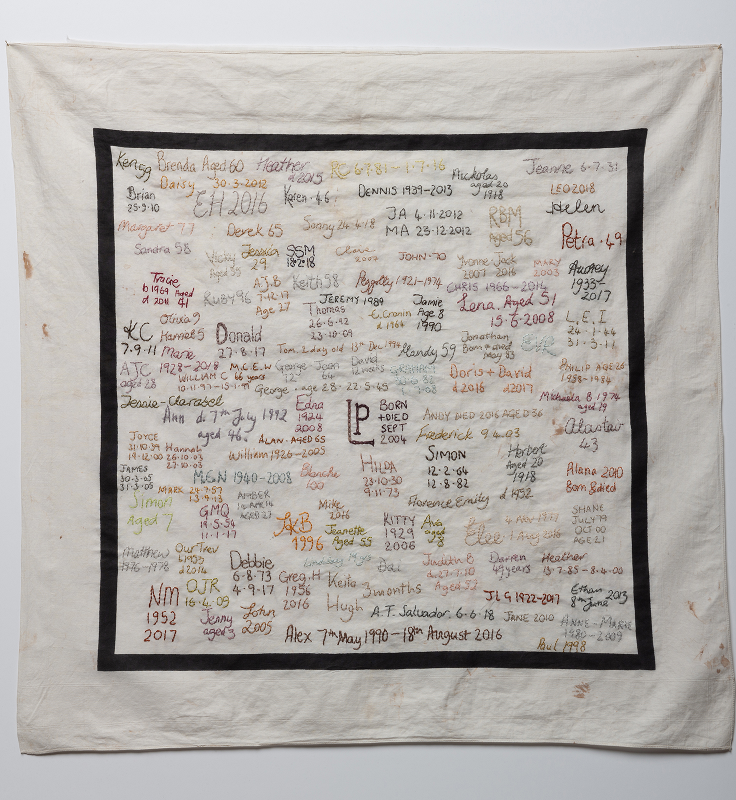 Memorial Sampler, purchased by Gawthorpe Textiles Collection is a memorial to over 100 lost loved ones with names gathered through social media and from exhibition visitors to Ruth’s exhibition at Gawthorpe in 2018.