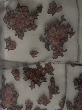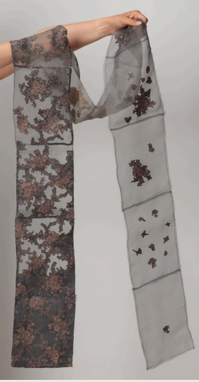 These pieces are made from leaves collected in special places, preserved as specimens in layers of silk netting. I chose damaged and decaying leaves, which I find beautiful and meaningful. The technique is based on Victorian pressed fern decorations.