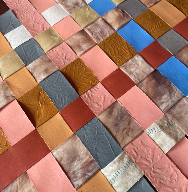 A printed paper and textiles piece about lost gardens that have been replaced with paving slabs. The blind emboss represents the colours of lost gardens and wildlife that lie below the paving. The weave indicates how modern life has taken precedence over the natural environment, yet bringing attention to the fact that one can still flourish alongside the other as a front garden.