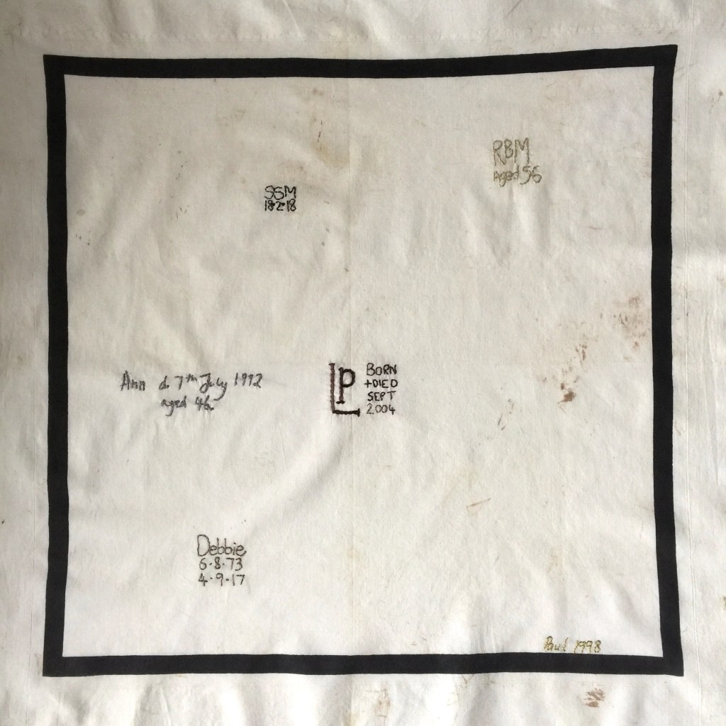 It is healing to preserve and remember the names of those loved and lost. This stitched memorial is a work in progress with names gathered from members of the public, friends and family. I am continuing to gather names, particularly those who died young. This work is inspired by stitched memorial samplers from the collection. If you would like to add your contribution, please leave some details on the form below. Please give initials or first name / initial only and either a date or age. I will be stitching more names onto the cloth during my Meet the Artist events and after the exhibition before it goes to another exhibition in 2019.