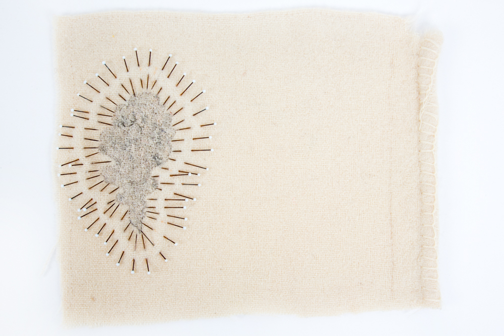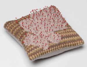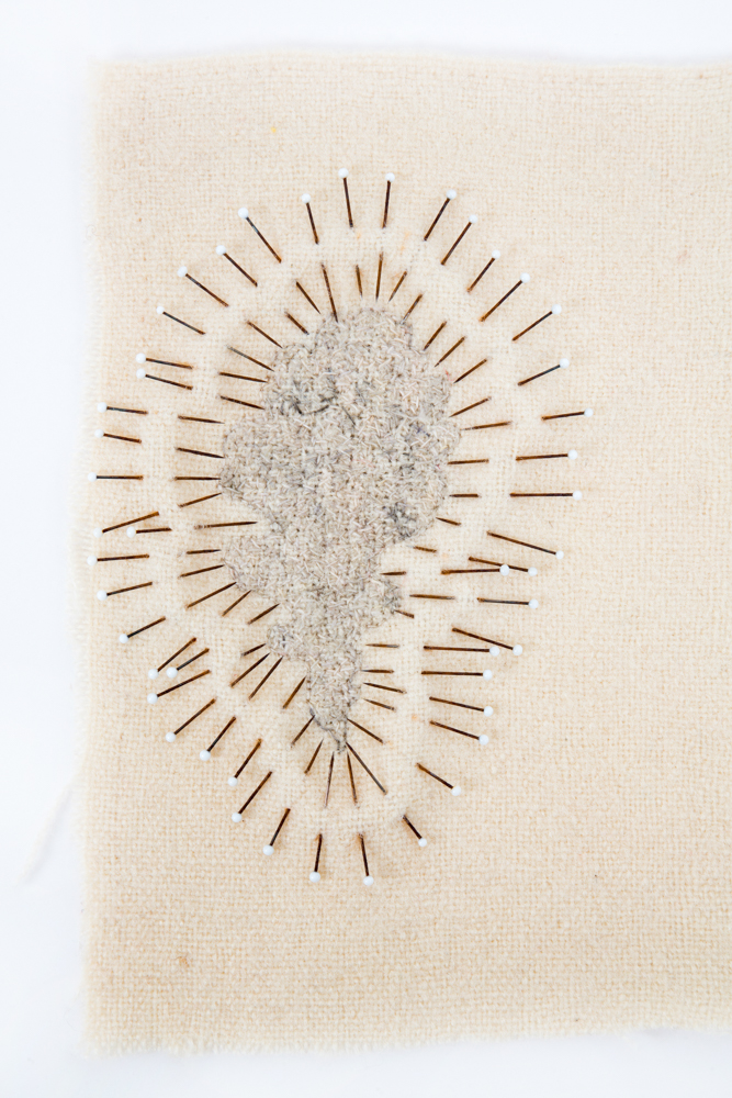 Vintage blanket, naturally-dyed wool threads, vintage pins. 2016. Framed £125