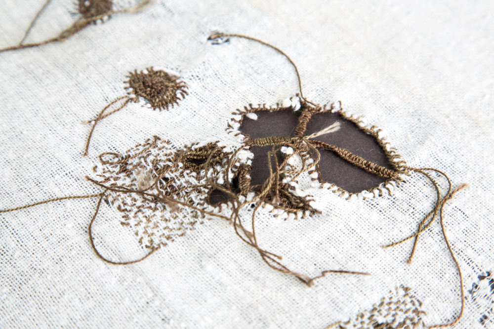 Naturally-dyed vintage cloth, hand embroidery, 2016. Framed. £165