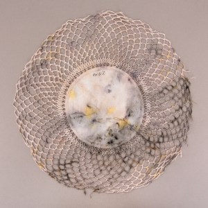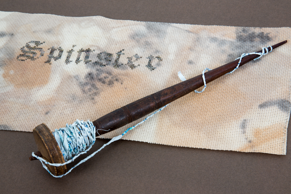 I enjoy reclaiming the word ‘Spinster’, which originally meant one who spins thread. This piece is made from strips of love letters, spun into yarn on an antique wooden spindle.