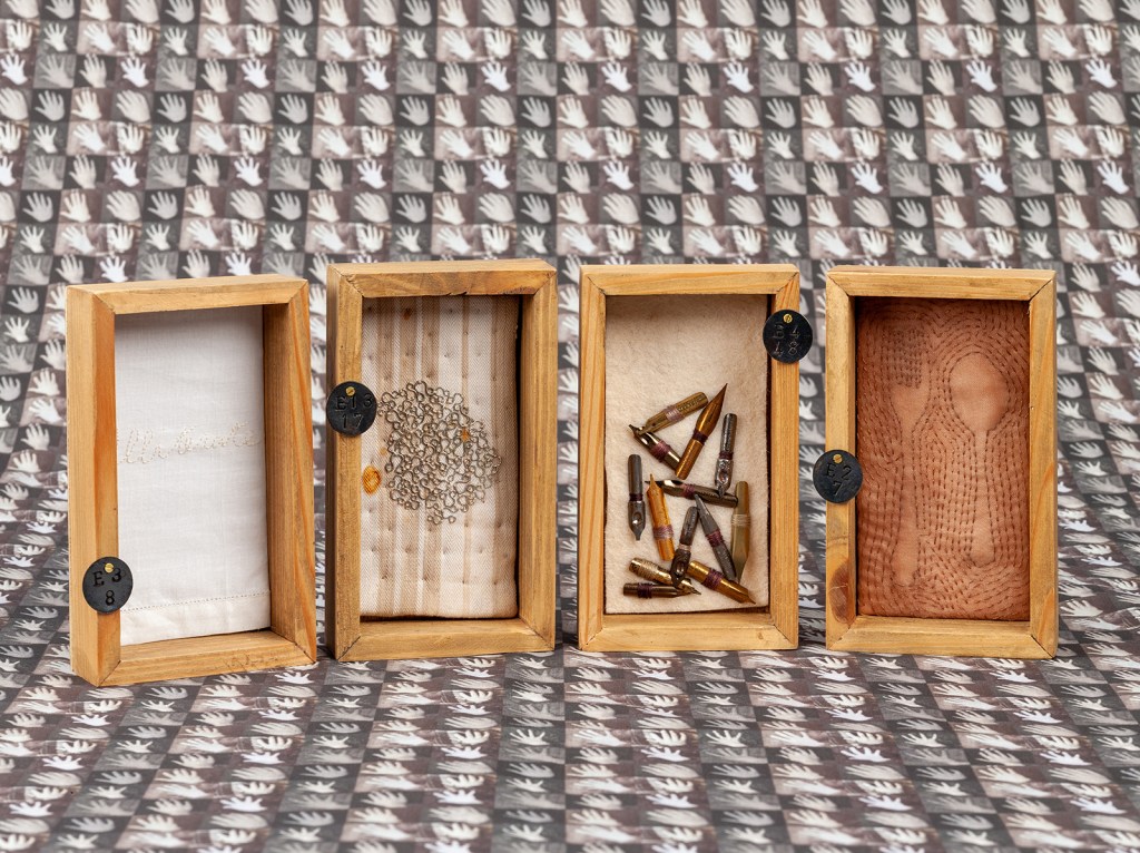 Techniques & materials include digital print on textile, metalwork, carving & hand embroidery using copper, found objects, textile, soap, coal and clay.