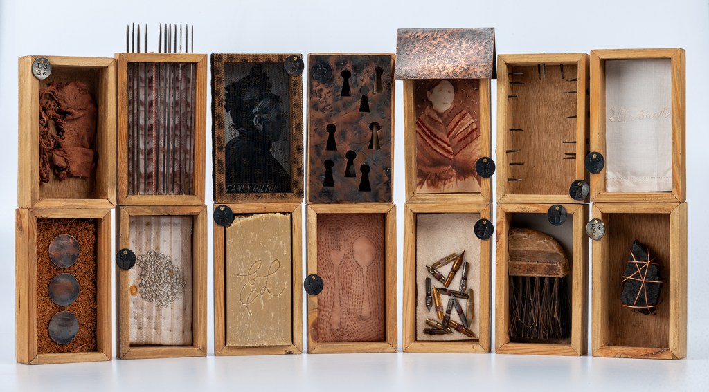 They also reflect the personal and working lives of the women including a bar of soap carved with the initials of a laundress and a box pierced with nails recalling a nail maker. Another includes coal which was commonly stolen. One holds a doormat, which Bridget Warrilow stole to sell for 3 pence to buy food. Each box is identified with a cell number which is how the women were identified in prison.