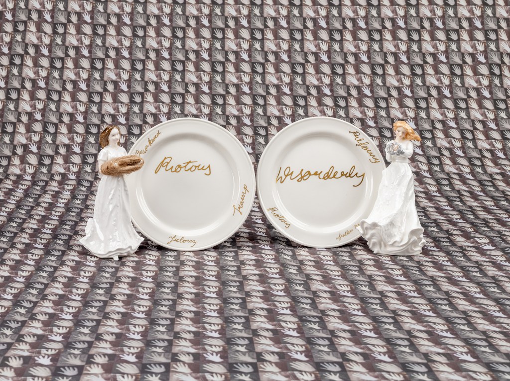 Techniques & materials include digital print on textile, ceramic decals and textile on found objects. Ceramics are made in Staffordshire.