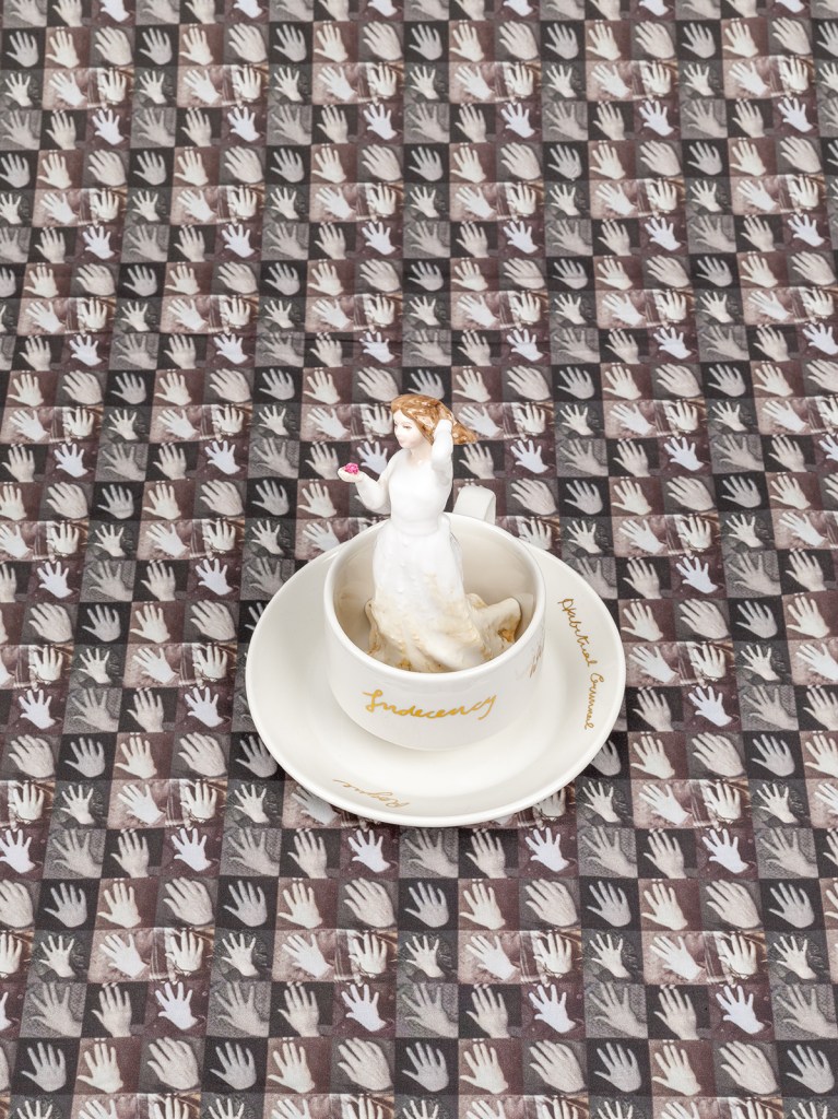 Techniques & materials include digital print on textile, ceramic decals and textile on found objects. Ceramics are made in Staffordshire.