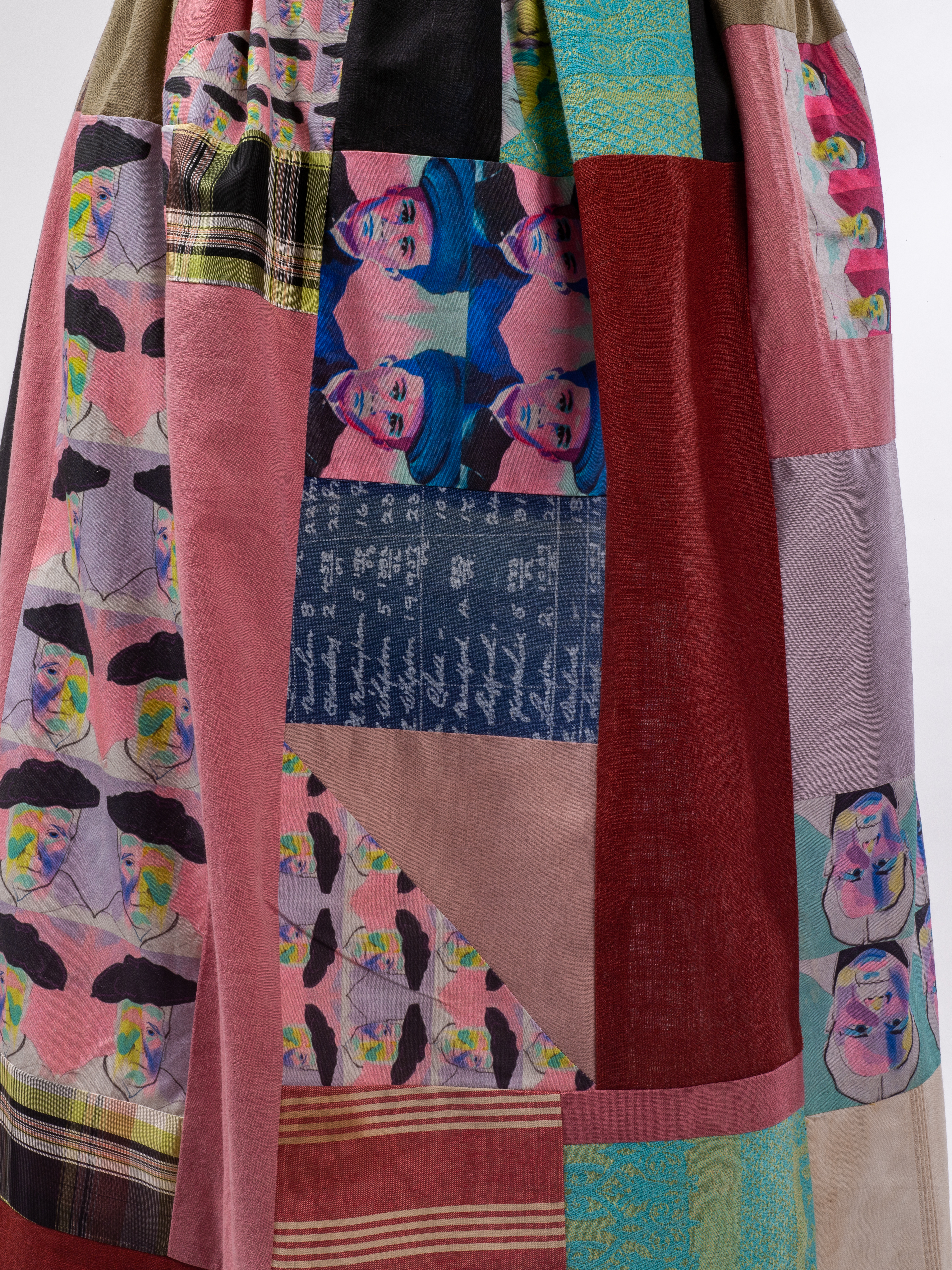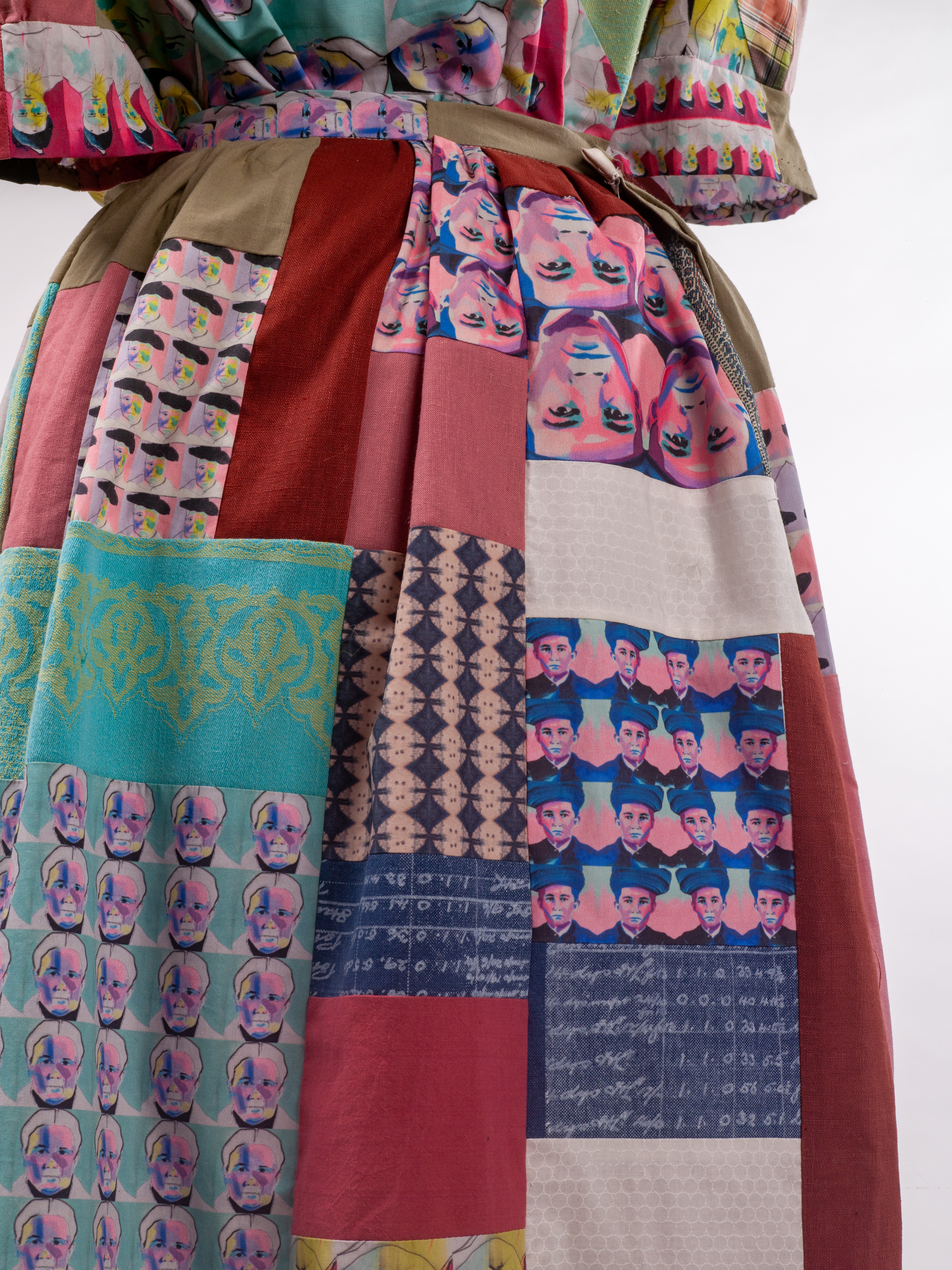 Digital manipulation, digital print on organic cotton, machine-made patchwork and garments using scrap and vintage fabrics. Ruth Singer, 2021