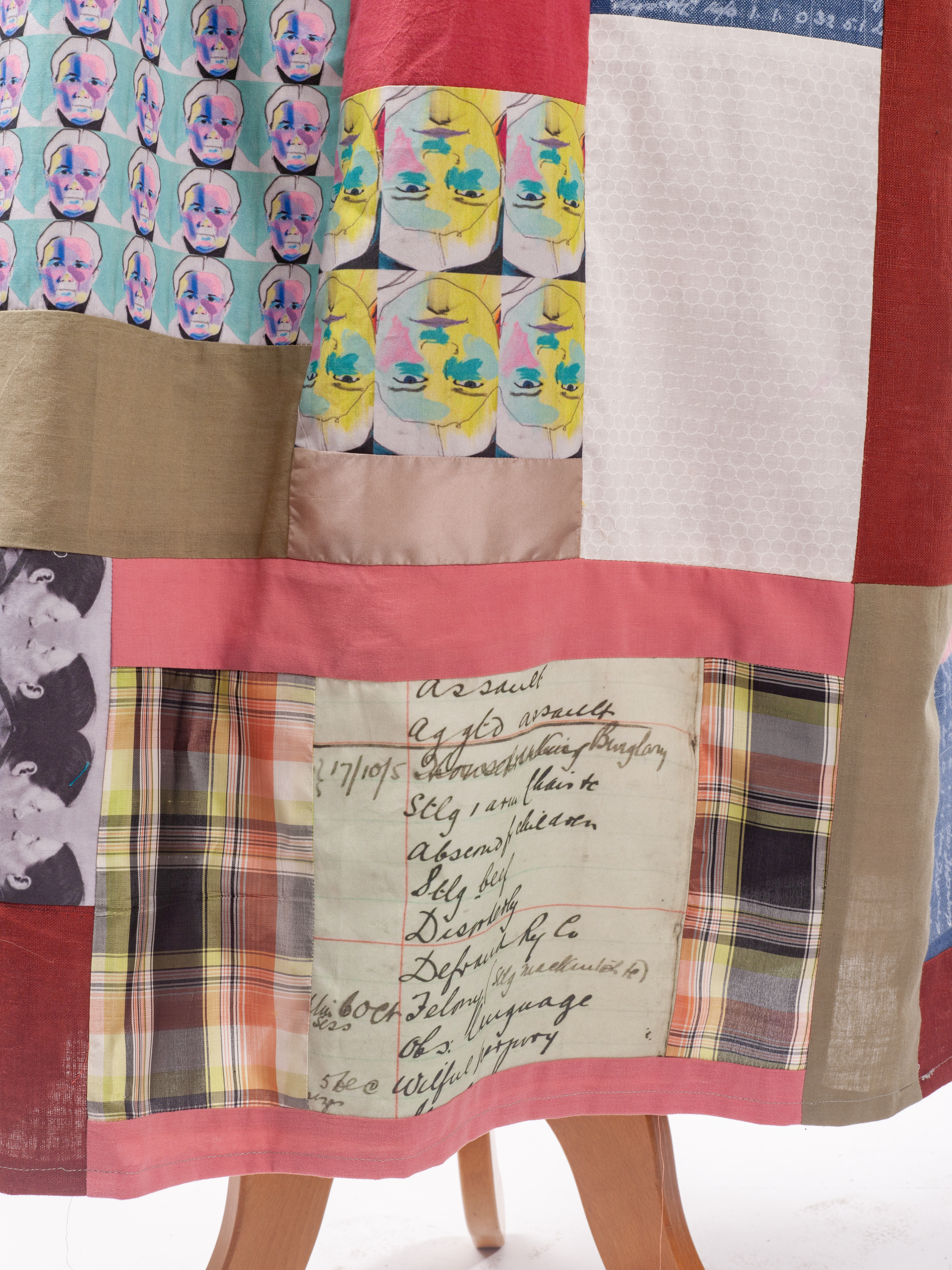 I have used Tim’s paintings to create digital-printed patchwork and assembled the pieces into a version of Victorian prison clothing. Prison issue clothing was drab and without individuality whereas this interpretation reflects the (imagined) passions, personality and vibrancy of the women depicted in the images.