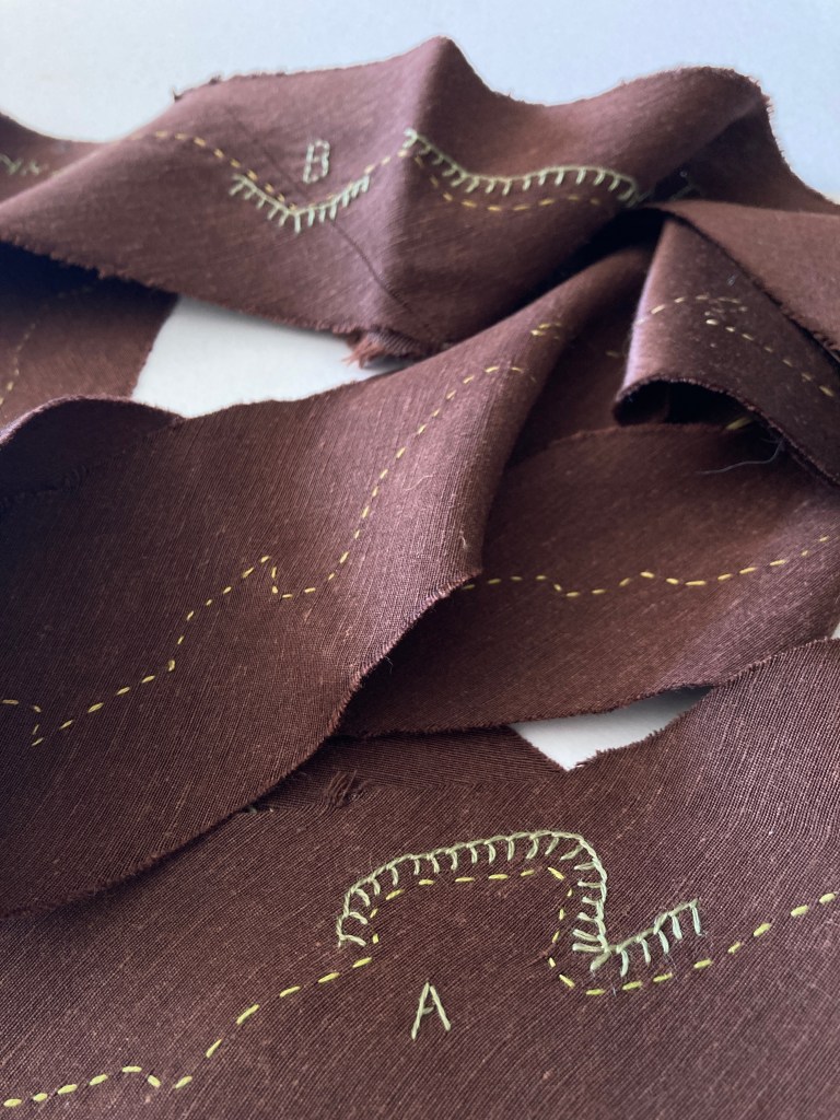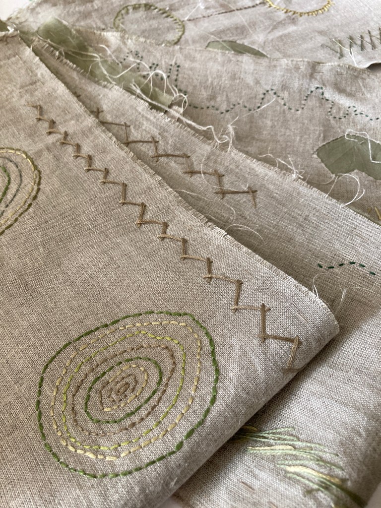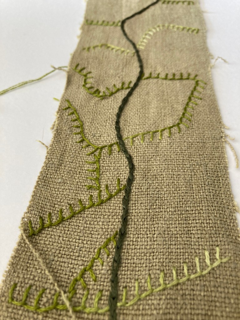 Hedge lines alongside the National Forest Way. Blanket stitches mark the hedges. Hand embroidered on vintage hemp.