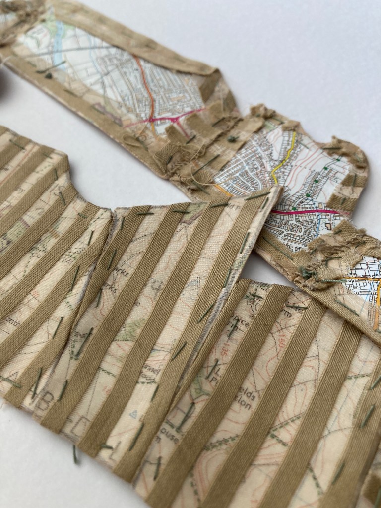 Patchwork of hedge / field shapes from a section of the National Forest Way. Old map of the area used as patchwork papers covered in silk, hand stitched.