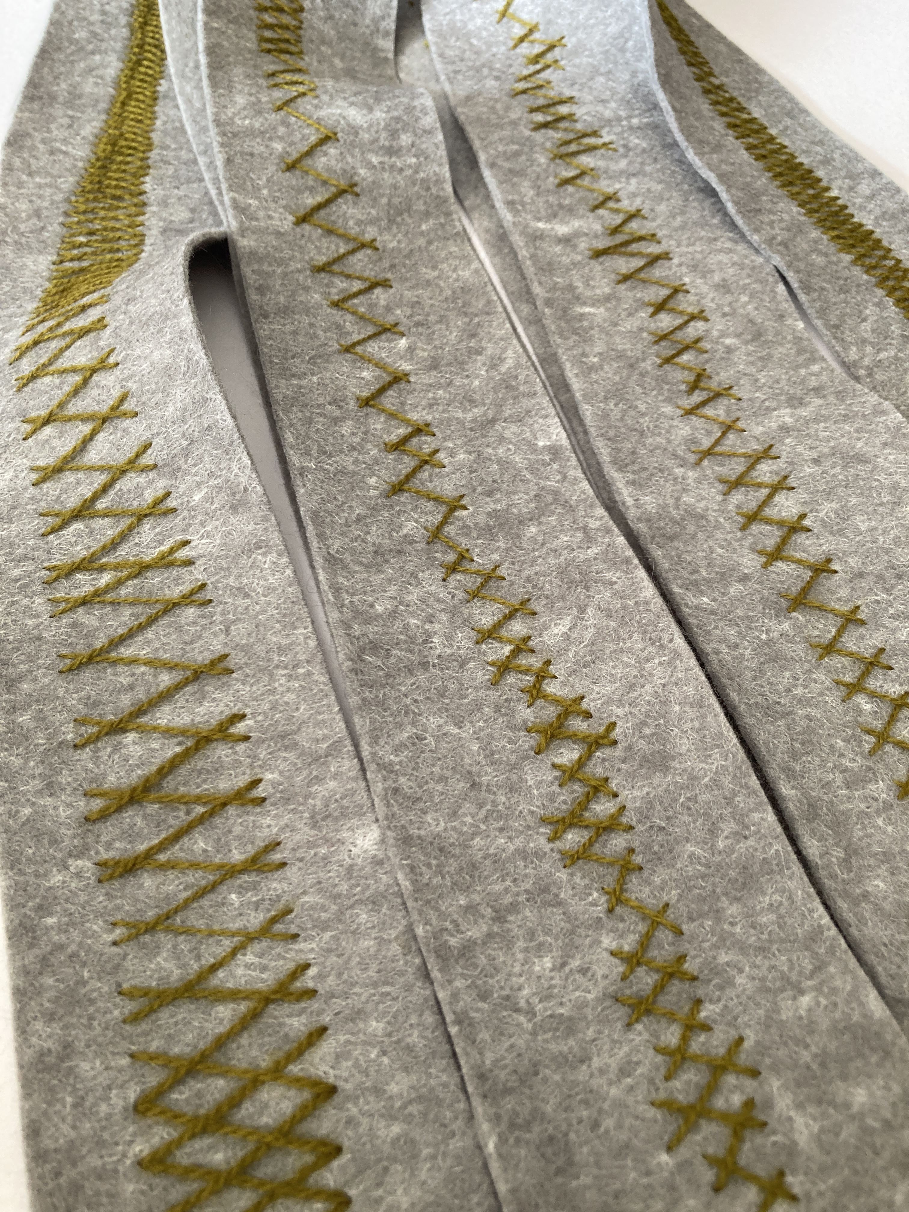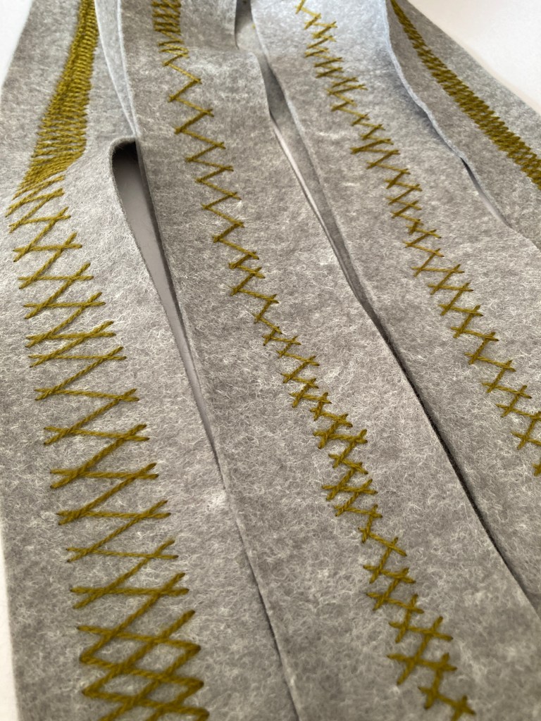 Hedge density in herringbone stitch. This long piece represents many different hedges which can be close clipped and dense or wild and overgrown and many states in between. Hand embroidered in wool on wool felt.
