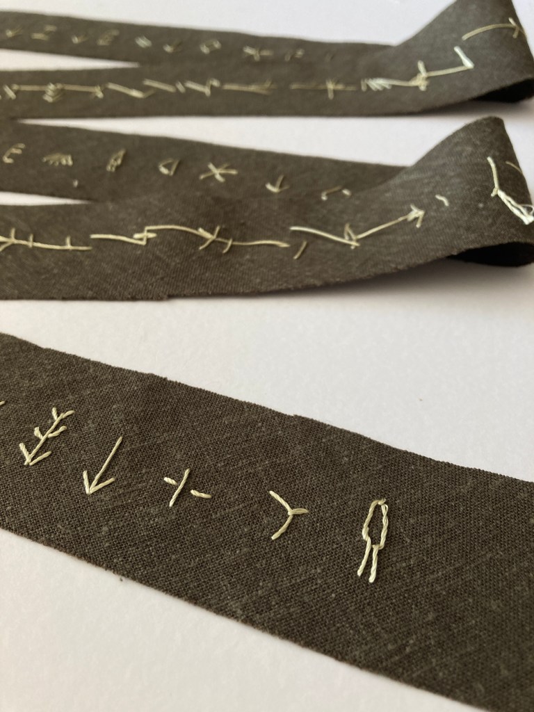 A list of all the species identified by hedge-spotter volunteers. Each type of tree has a unique stitch shape. The order is the order they appeared in the spreadsheet. Hand embroidered on hemp.