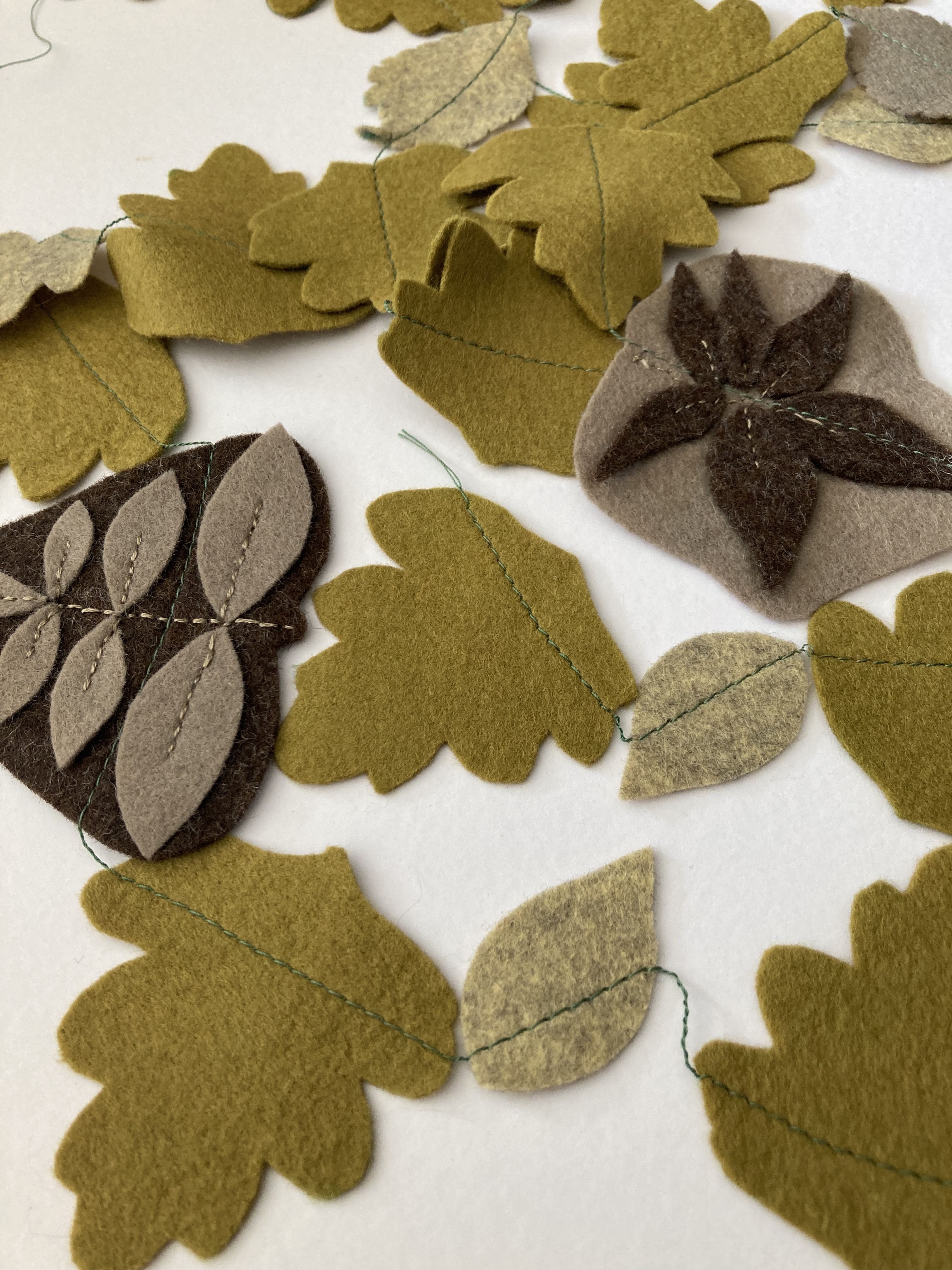 Species garland showing the dominant species in the sections of hedge surveyed by volunteers. Hawthorn is by far the most common. Wool felt, hand cut, machine stitched.