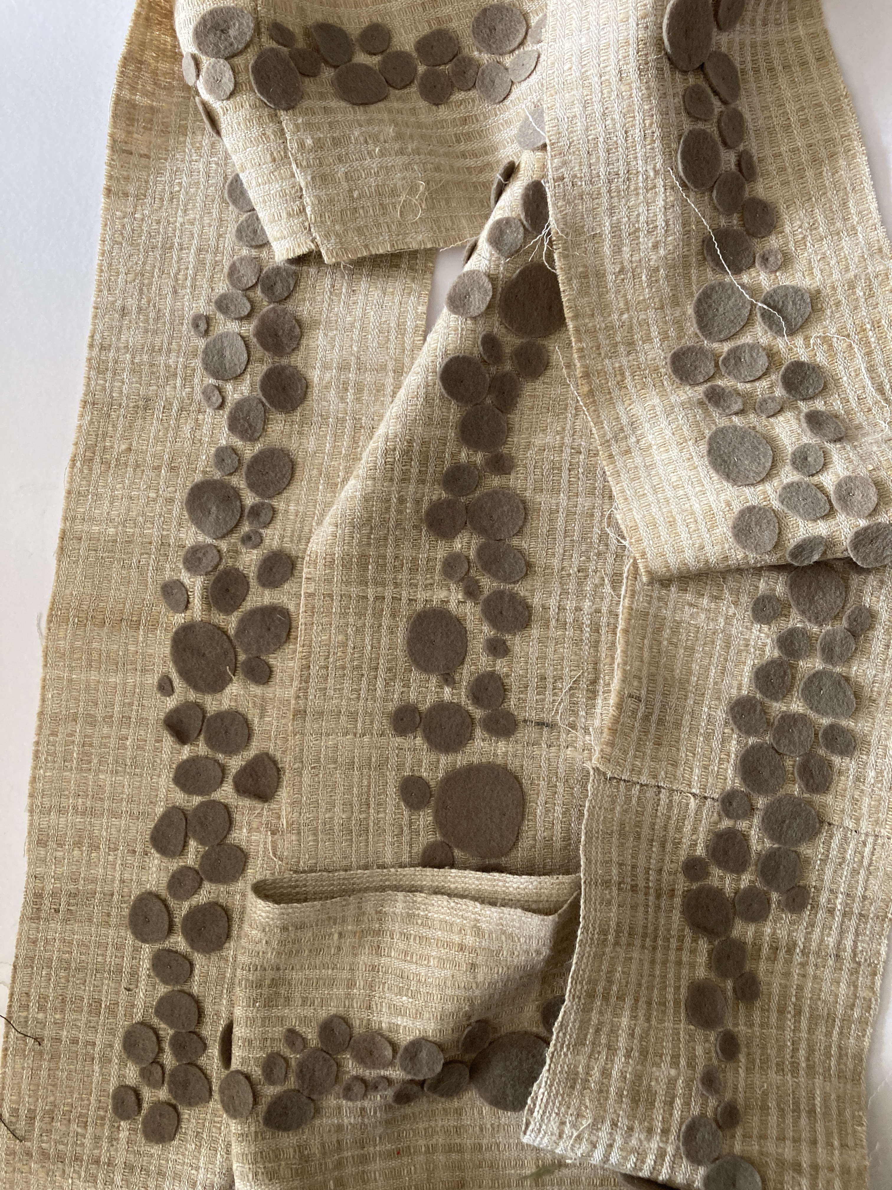 Hedge density – each felt circle represents stems of hedges which vary in density and size. Wool felt on peace silk, hand stitched.
