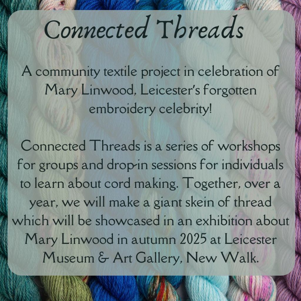Connected Threads is about making textiles together. We will run a series of workshops for groups and drop-in sessions for individuals to learn about cord making. Together, over a year, we will make a giant skein of thread which will be showcased in an exhibition about Mary Linwood in autumn 2025 at Leicester Museum & Art Gallery, New Walk.