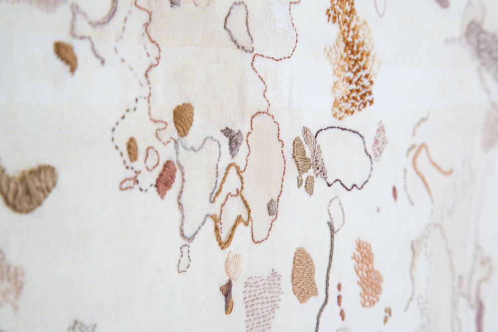 These embroideries are old tablecloths which I have placed in cafes and at gallery events to gather the marks of wear and use. I then embellish them by stitching the stains, preserving them like memories or tales being handed down through generations. Visitors and participants have a real impact on the work: it does not exist without their input.